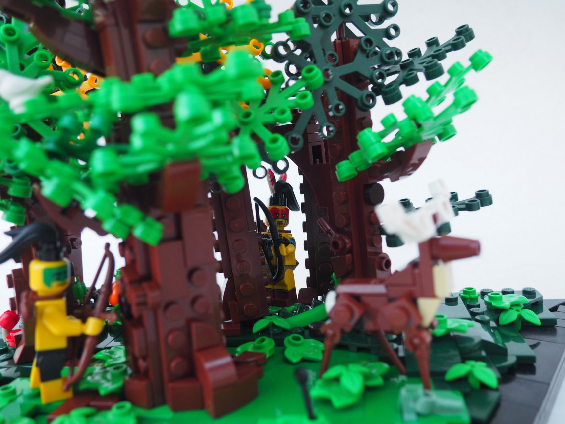 Day two‘s prompt was historical. This was defined as 500-1800, which is an incredibly broad time period! I knew that castle and pirates were firmly in my comfort zone, but I also knew that they were in lots of other builders’ comfort zones as well. So I tried to branch out a bit. I started with Lexington Green, but that seemed too flat and dull for a vignette. I tried to spice it up with a unique border, but a simple row of firing redcoats was still not cutting it for me. A few trees later, I was losing the redcoats altogether. So I switched to Indians deer hunting.