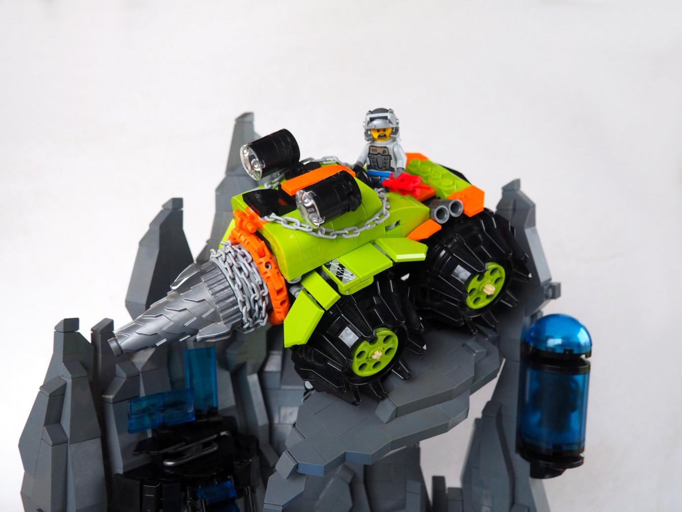 The support system isn’t that complex. This 2×4 plate is rotated in every direction (with the help of a mixel joint) and the plates running between the two rock pillars are what really supports the Thunder Driller’s weight. Then there’s also that chunk of rock coming out under the drill. This is only supported by a bar and clip connection; it’s not that heavy–and it’s not supporting any of the drill’s weight!