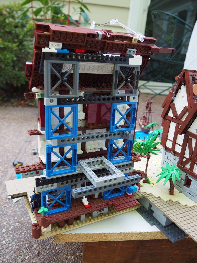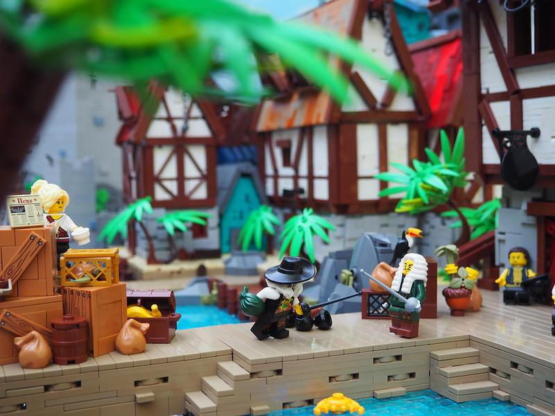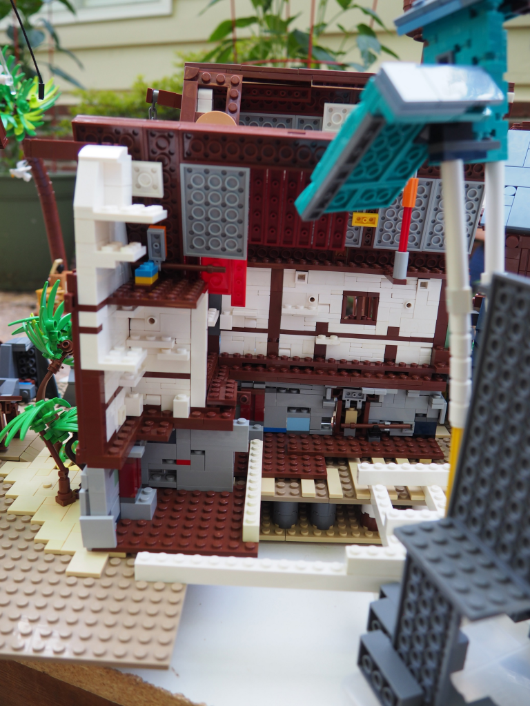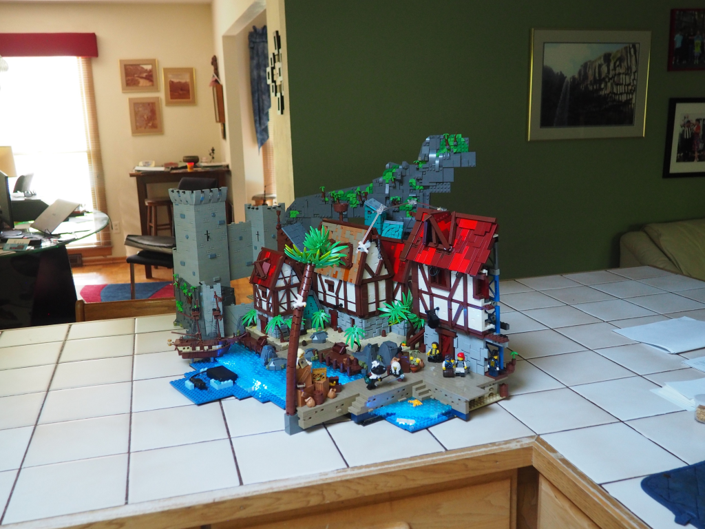 The whole MOC is pretty large, with the biggest section being the houses and port. You can also see the lights under the water in this picture, though unfortunately they didn’t really come through at all in the final angles.