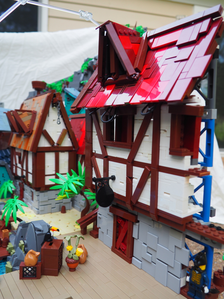 I built all the tudor houses, which aside from the roofs, were pretty fun. I used a lot of the relatively new 1×1 hump pieces to add some texture to the walls and built the stonework on the bottom with lots of half-plate offsets and sideways bricks.